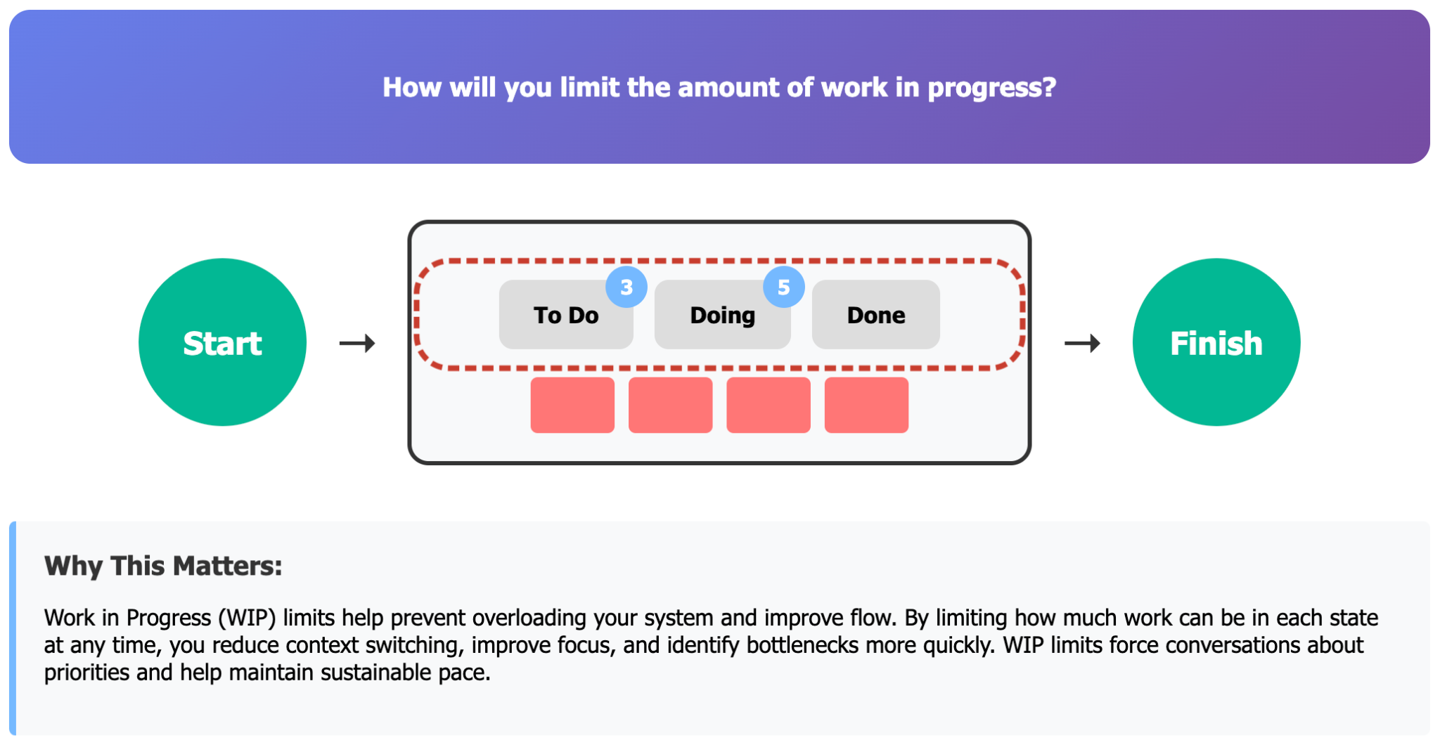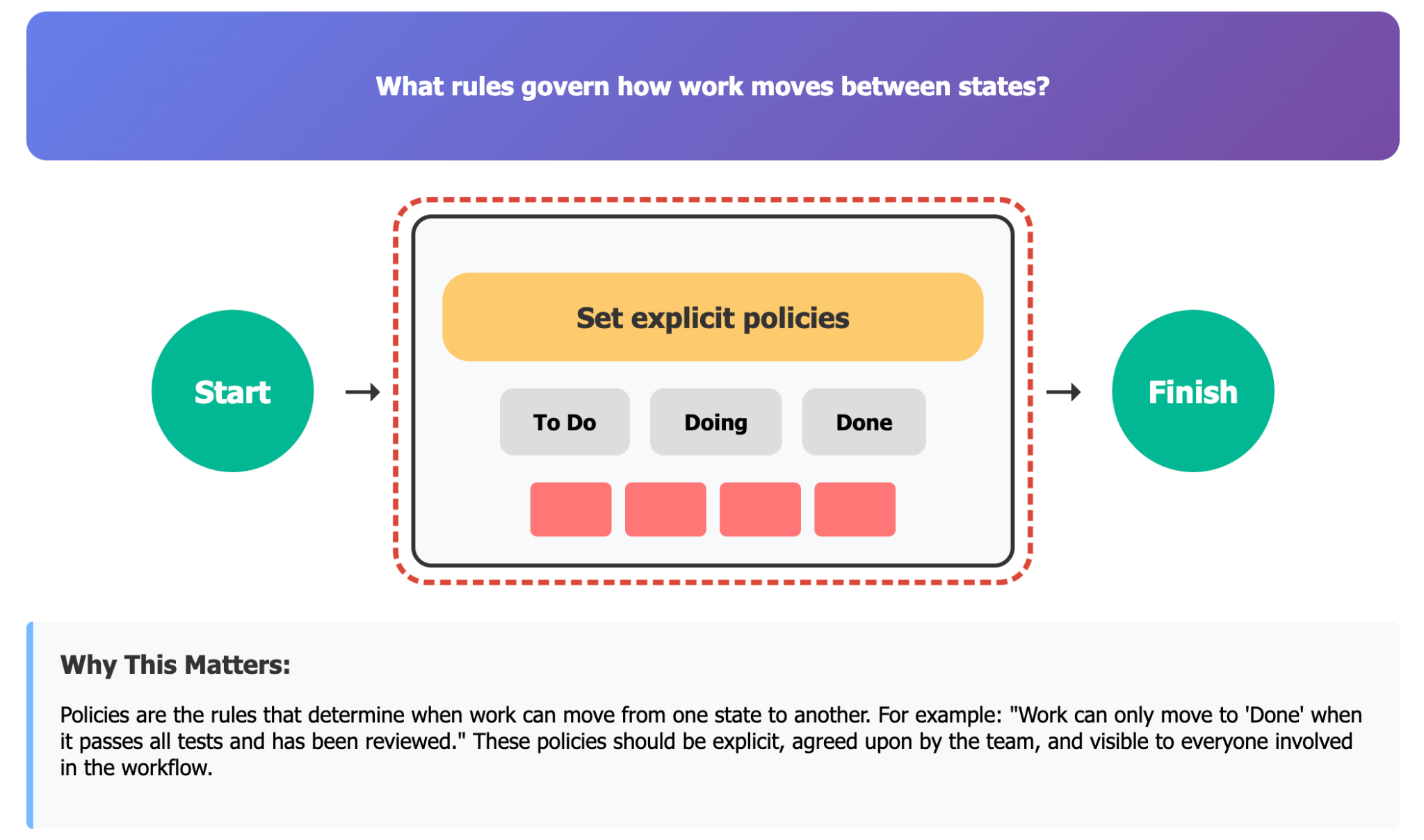Explicit policies define how work items can move from one state to another. These policies ensure consistency, reduce ambiguity, and help in managing expectations.