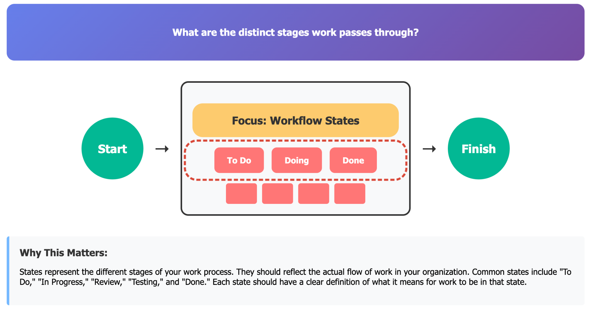 Workflow states are the distinct phases that a work item moves through from its start point to its finish point. These states help in tracking progress and identifying bottlenecks.